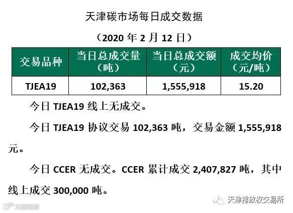 2020年2月12日天津碳市场成交公告