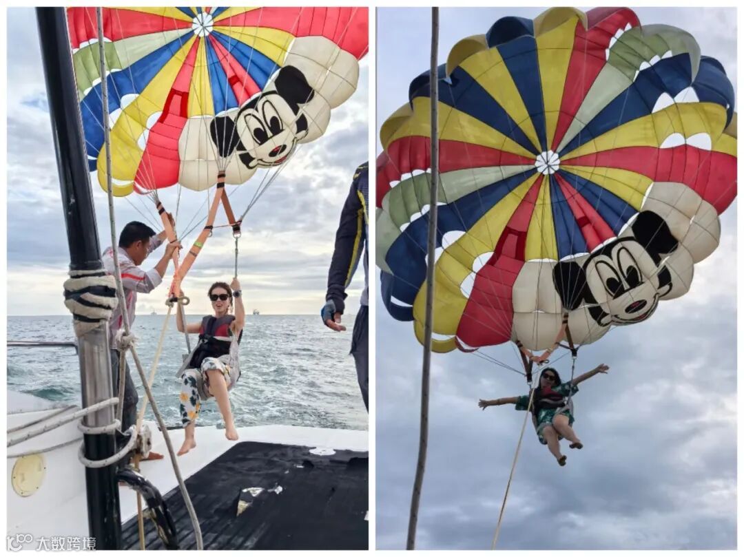 当巨大的彩色降落伞带着大家缓缓升空,蜈支洲岛的美景尽收眼底。大家就像自由的鸟儿,在蓝天白云下翱翔。