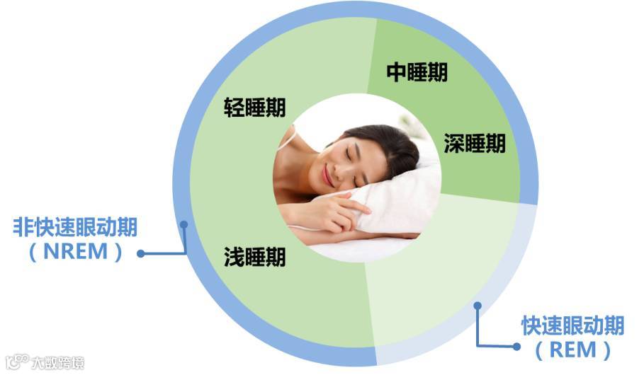 人在睡眠过程中,脑电波、肌电波及眼球活动的变化,会使得睡眠产生周期阶段。睡眠周期由非快速眼动期(NREM)和快速眼动期(REM)组成。在非快速眼动睡眠的过程中,会产生浅睡期、轻睡期、中睡期和深睡期4期,然后进入快速眼动睡眠期。此时一个睡眠周期结束,而后继续启动下一个睡眠周期。人的夜间睡眠,一般分5~6个周而复始的周期,每个睡眠周期约60分钟~90分钟。