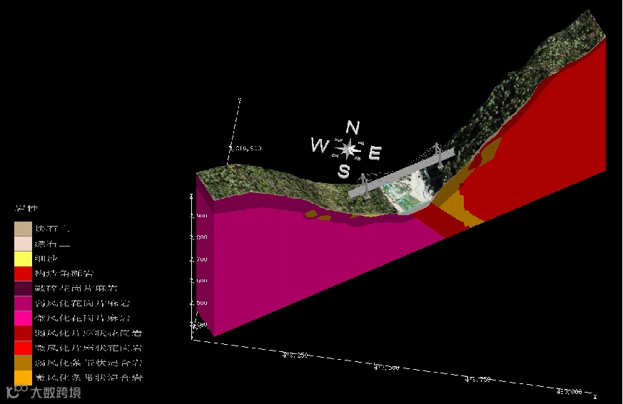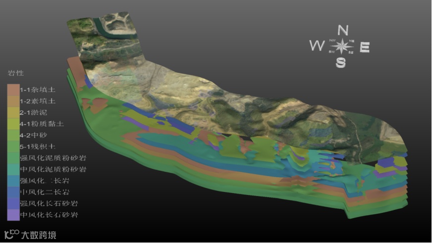 下图为湖北省某人工连通渠三维地质模型。利用EVS软件,对上千个钻孔进行地层建模,并将卫星影像准确贴附在模型表面,形象地展示了项目区域内实际地形情况,可直接在模型上进行渠道的挖、填方量计算1日需修改渠道开挖方案时,只需修改典型断面,软件能迅速得出挖、填方量,也可显示各个地层的挖、填方结果,方便设计人员不断调整方案,减少工程量计算时间,提高设计人员工作效率。