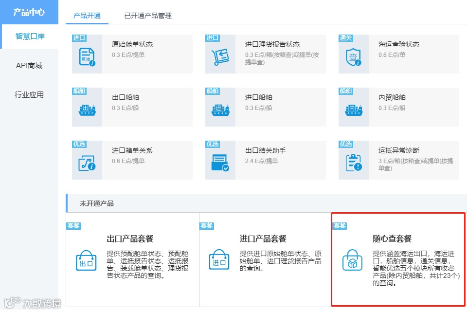 随心查包月特惠套餐正式上线,覆盖智慧口岸当前所有收费产品(内贸船舶除外),三档可选,一单通查(同一单号查询套餐内所有产品,仅计费一次),低至0.6E点/条。