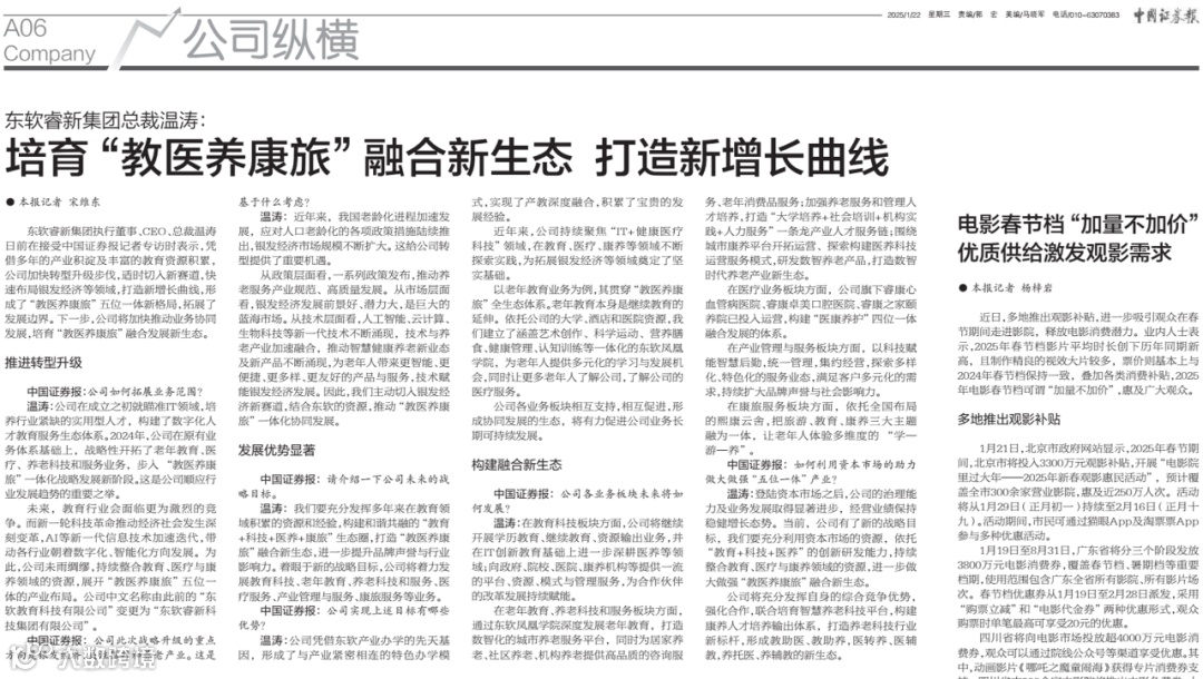 日前,在东软睿新科技集团教医养康旅战略发布之际,东软睿新科技集团执行董事、CEO、总裁温涛博士接受了中国证券报记者专访,1月22日《中国证券报》A06版刊载了专访报道,全文如下: