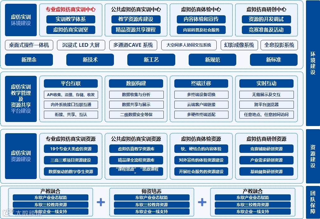 东软教育依托新一代信息技术,如AI-XR、元宇宙、虚拟仿真、增强现实等,构建基于真实岗位情境的虚拟仿真实验室和实训室,为学生提供了全新的学习方式,同时也为教育的未来发展带来了无限的可能性。虚拟仿真实训教学场所主要分为:专业虚拟仿真实训中心(必建内容)、公共虚拟仿真实训中心、虚拟仿真体验中心、虚拟仿真研创中心。