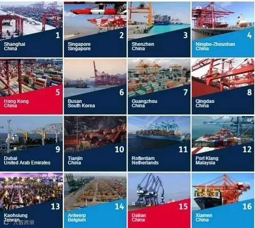 英国劳氏日报近日公布2016世界集装箱港口100强榜单,前十榜单中,中国占据了七大席位。分别是上海港(第一)、深圳港(第三)、宁波舟山港(第四)、香港港(第五)、广州港(第七)、青岛港(第八)和天津港(第十)。中国共有22个港口上榜。