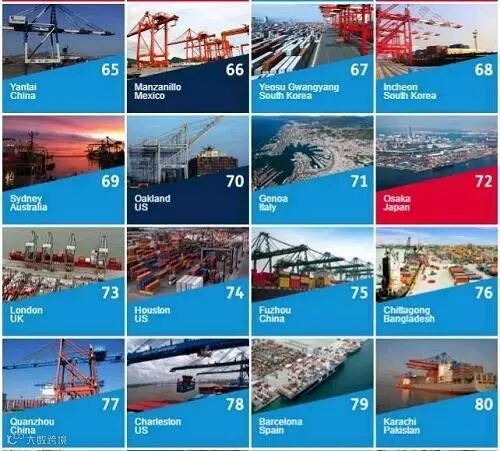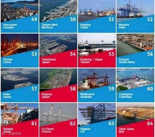 据资料统计,中国其他上榜港口,还有大连港位居第15位,厦门港紧随其后位居16位,营口港位居第23位,连云港第28位,太仓港位居第39位,东莞虎门港位居第43位,南京港位居第51位,日照港位居第53位,第55基隆+台北,烟台港位居第65位,福州港位居第75位,泉州港位居第77位,丹东港位居第84位,唐山位居第94位(新上榜),台中第97位。