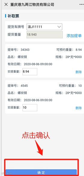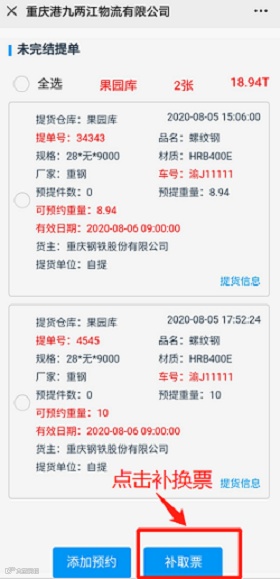 2、在【未完结提单】列表中选择需要换票的提单,点击【补取票】,选择补取票的车牌号,点击【确定】。