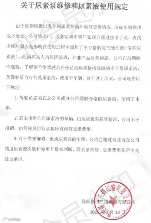 由于近期频繁出现车辆尿素泵损坏维修更换情况,造成车辆使用成本增加。公司修理厂、服务站和车辆厂家联合通过技术手段,查找出损坏原因是车辆在使用过程中添加了不合格的尾气处理液(俗称尿素液)。此损坏系人为原因造成,并非产品质量问题。公司在前期暗中观察,了解到不少驾驶员在外私自购买价格低廉的不合格尿素液,及驾驶员自行勾兑尿素液,使用于车辆。鉴于以上因素,公司现作以下规定: