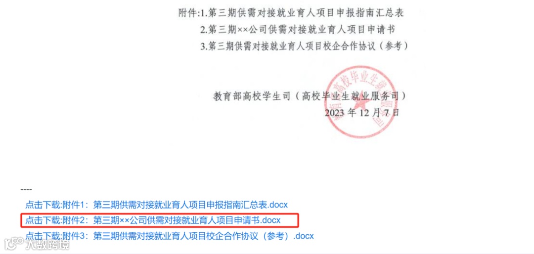 点击《关于公布第三期供需对接就业育人项目申报指南的函》网页底部附件链接,下载“第三期××公司供需对接就业育人项目申请书”。