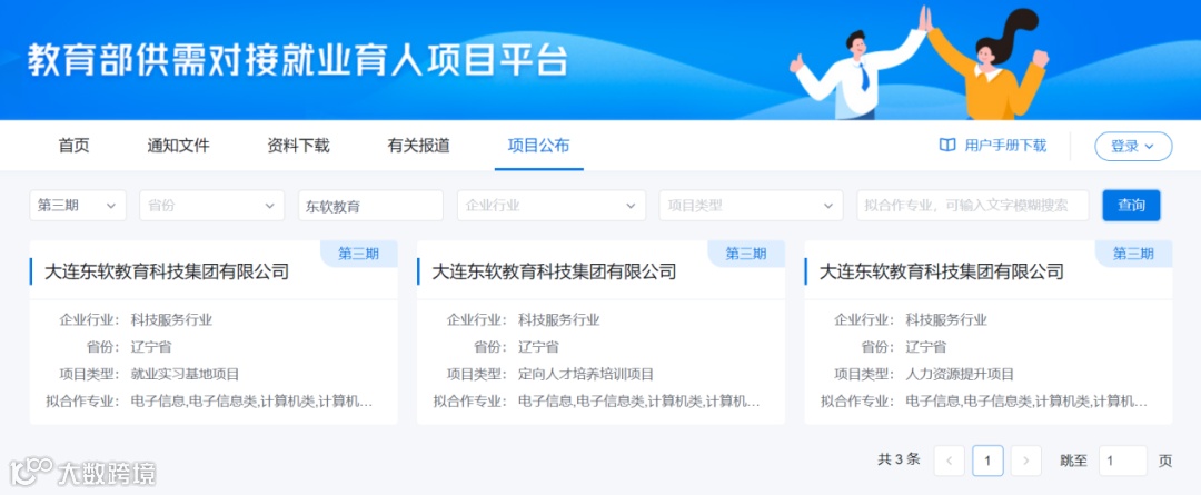 12月7日,教育部发布了《关于公布第三期供需对接就业育人项 目申报指南》的函,东软教育科技集团“就业实习基地、人力资源提升、定向人才培养培训”三个项目获批本期供需对接就业育人项目。