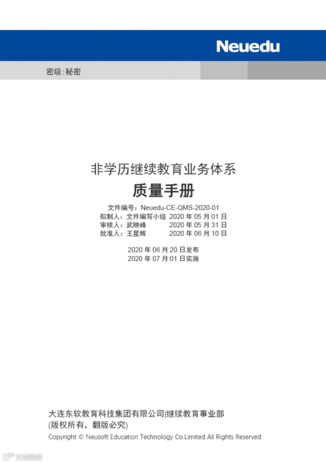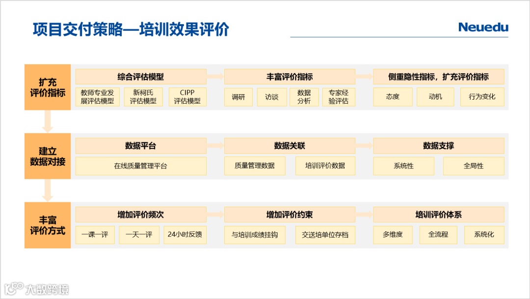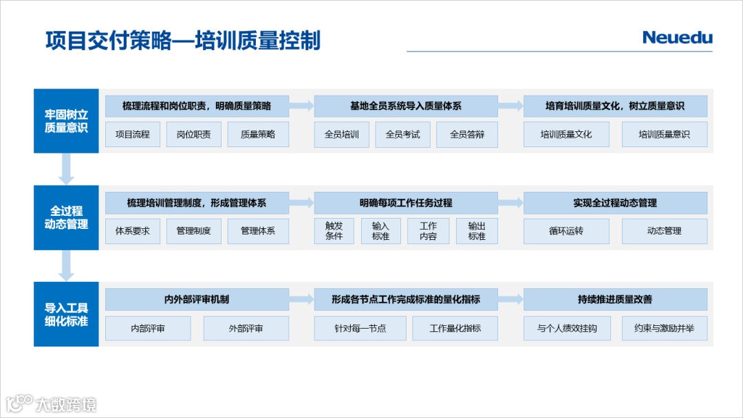 东软教育按ISO10015质量管理体系要求,制定了《培训质量管理体系文件》,执行质量(Q)、评价(A)、成果转化(T)三位一体的培训绩效管理机制,为规范项目设计、项目实施与项目质量管理等工作提供有力支撑。