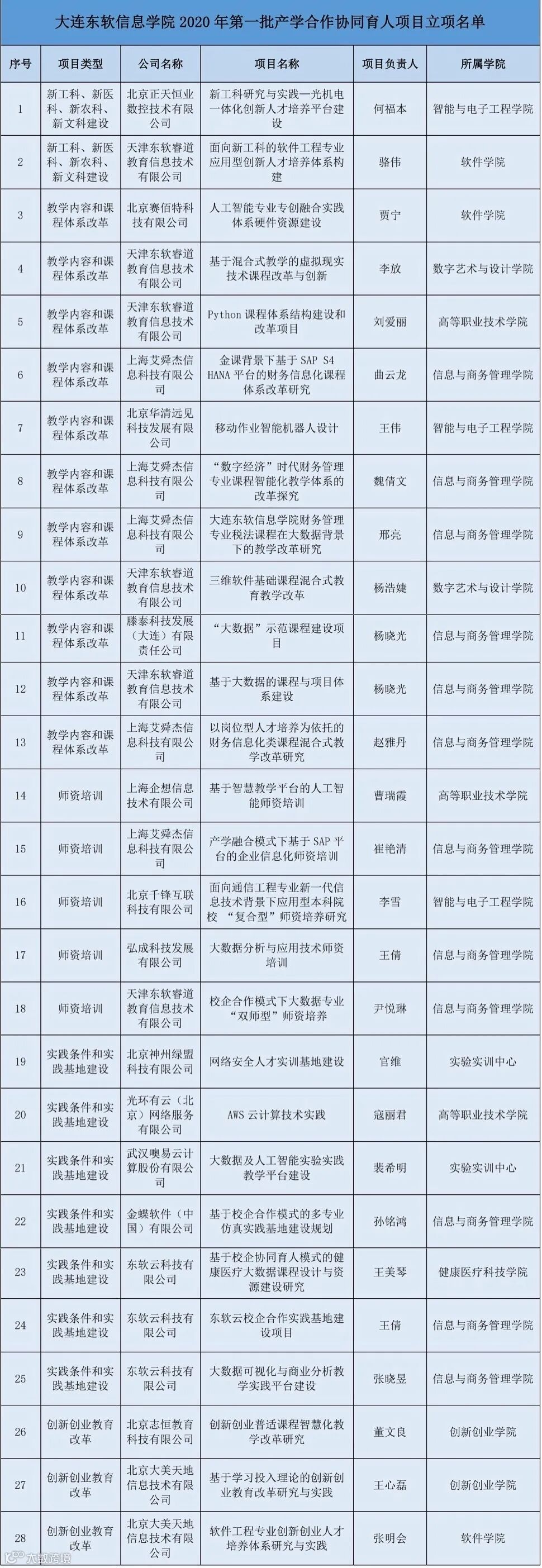 大连东软信息学院获批的2020年第一批产学合作协同育人项目涵盖了创新创业教育改革,教学内容和课程体系改革,师资培训,实践条件和实践基地建设,新工科、新医疗、新农科、新文科建设5类,合作对象包括北京赛佰特科技有限公司、北京华清远见科技发展有限公司、上海艾舜杰信息科技有限公司、上海企想信息技术有限公司、北京正天恒业数控技术有限公司等16家企业。28个立项项目中,软件学院3项、信息与商务管理学院12项、智能与电子工程学院3项、数字艺术与设计学院2项、健康医疗科技学院1项、高等职业技术学院3项、创新创业学院2项、实验实训中心2项。