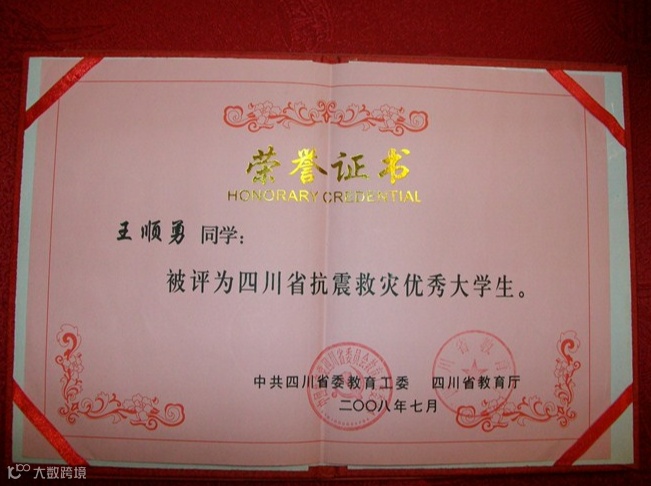 王顺勇做的这一切,师生们都看在眼里,更感动于心。2008年7月,王顺勇被四川省委教育工委评为四川省抗震救灾优秀大学生;被学校授予优秀学生干部特殊贡献奖。