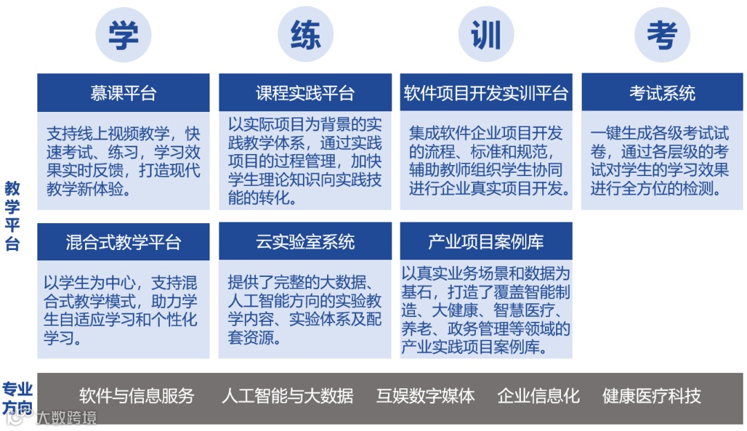 东软教育基于东软雄厚的产业优势与学历教育丰厚的办学积淀,充分发挥自身技术优势,借以强大的应用研究与开发团队,自主研发了涵盖慕课平台、课程实践平台、软件项目开发实训平台、混合式教学平台、产业项目案例库、云实验室系统、考试系统的智慧教学平台,覆盖软件与信息服务、人工智能与大数据、互娱数字媒体、企业信息化、健康医疗科技等专业集群,为院校提供集“学、练、训、考”一体化的智慧教学综合解决方案,支持院校有效的开展理实一体化教学、推进线上线下混合式教学改革,以精准的学习大数据驱动个性化教育,助力院校应用型人才培养。