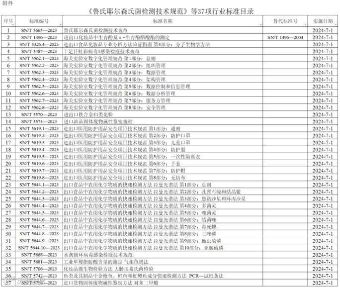 根据海关总署于1月2日发布的公告,现发布了《鲁氏耶尔森氏菌检测技术规范》等37项行业标准。这些标准的目录可以在附件中查看。同时,被代替的标准《化妆品中生育酚及α—生育酚醋酸酯的检测方法 高效液相色谱法》(SN/T 1496—2004)将自新标准实施之日起废止。