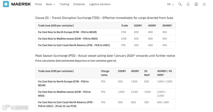 此外,马士基在1月4日发布了最新公告,由于绕道好望角增加了成本,宣布对多条航线征收运输中断附加费(TDS),该费用立即生效。同时,由于严重的运营中断,马士基还宣布征收旺季附加费(PSS),该费用从1月1日起生效,直至另行通知。以远东到北欧航线为例,每个20英尺干箱的运输成本将增加500美元。