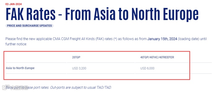 根据达飞(CMA CGM)发布的最新公告,自2024年1月15日(装货日期)起,从亚洲到北欧航线将征收新的FAK费率。每20英尺箱收费3200美元,每40英尺箱收费6000美元,具体费率有效期至另行通知。此外,根据达飞在12月29日的通知,从2024年1月1日起至另行通知,从亚洲到北欧的冷藏箱还将征收旺季附加费PSS,每20英尺箱收费500美元,每40英尺箱收费1000美元。