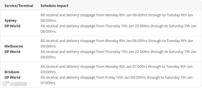 根据消息,DP World Australia于1月4日收到了澳大利亚海事联盟部门(CFMMEU)针对布里斯班港、悉尼港、墨尔本港和弗里曼特尔港各个码头的额外保护性工业行动通知。这次罢工行动将持续到2024年1月15日。