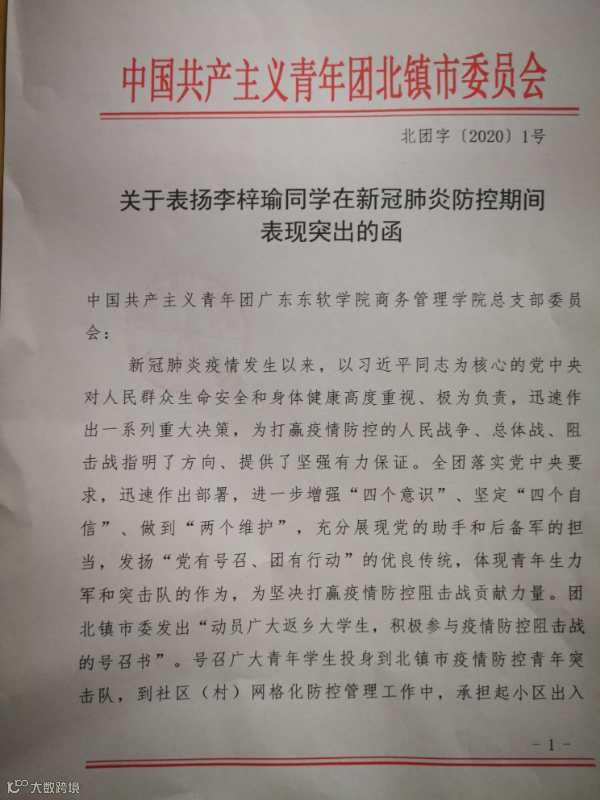 李梓瑜同学获得共青团北镇市委员会的表彰