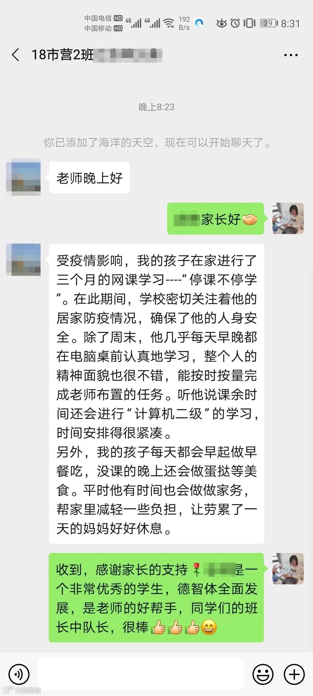 “您的家访让我们全家人都非常感动,您对每个学生的负责任、因材施教是孩子们可遇不可求的福分。”李妈妈在信中写道:“这段时间以来,您对这些孩子的付出远比正常在校时更多,更多地耗费您大量的精力!从安排教学,协调上课,各种上网软件的学习应用,到各个班级的管理,孩子们状态的调整,各种在家学习的督导,天南地北的每个学生都是您的牵挂。您的不容易我们有目共睹。可敬天下老师恩,为了孩子的成长,您比我们做家长的更尽心尽责尽力!”
