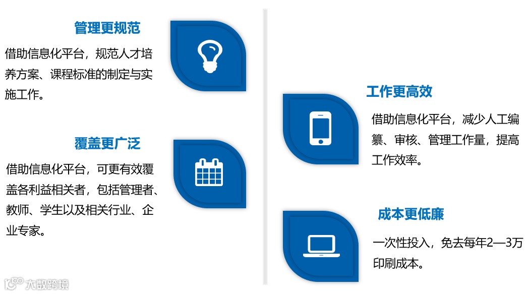 ☑ 课程标准集中管理:实现校级、系部课程标准数字化、可视化集中管理,便于二级学院、教务、质保部门了解课程标准的制定与实施;