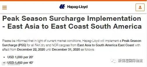 除此之外,东亚至南美东海岸征收旺季附加费 根据当前的市场状况,赫伯罗特将对从东亚至南美东海岸的所有FAK干箱和冻柜货物征收旺季附加费(PSS),自2020年12月22日至2020年12月31日生效如: