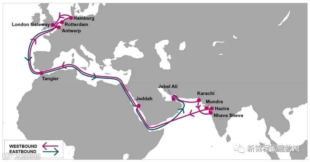 印度洋服务(IOS)将由ONE,THEA的合作伙伴赫伯罗特、达飞轮船和中远海运运营,挂靠港口为:Jebel Ali –卡拉奇– Nhava Sheva – Hazira – 蒙德拉 –Jeddah WB – Tangier –鹿特丹–汉堡–伦敦–安特卫普– Tangier –Jeddah– Jebel Ali。