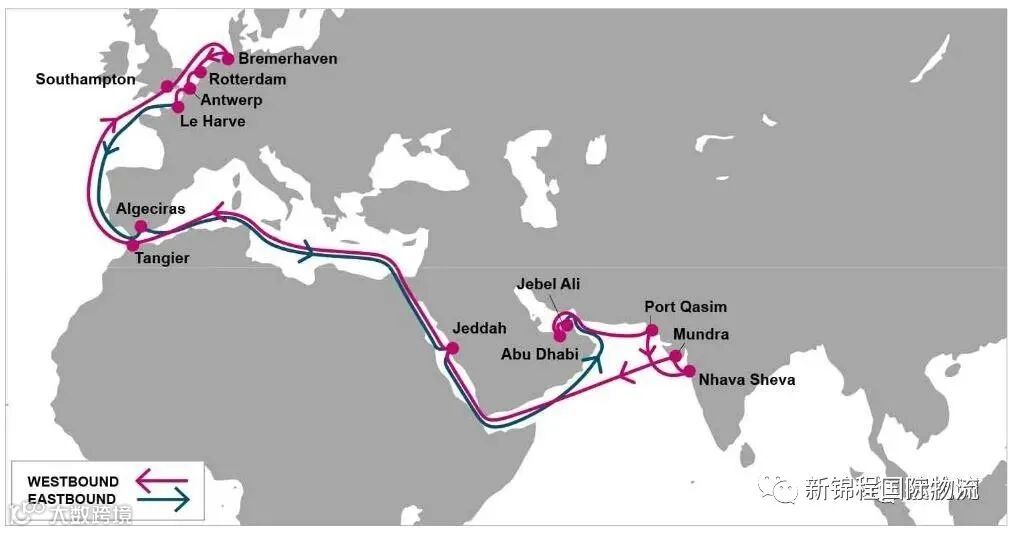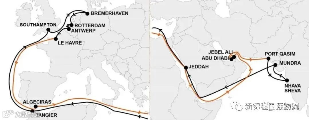 此外,除了船公司赫伯罗特以外,这些公司将在IOS 2中进行合作,IOS 2将进行以下港口挂靠:Jebel Ali –阿布扎比–卡西姆港– Nhava Sheva – 蒙德拉 –吉达–Tangier –南安普敦–不来梅港–鹿特丹–安特卫普–勒阿弗尔–阿尔赫西拉斯–吉达– Jebel Ali。