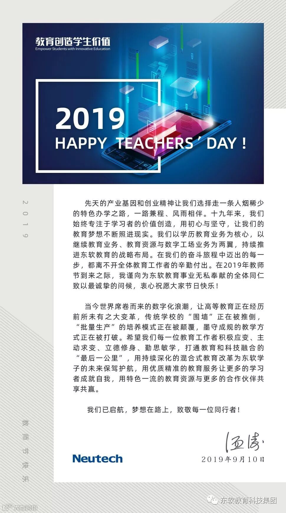 岁月不居,时光不语。转眼间第35个教师节已经来临,在这个特别的日子里,集团董事长刘积仁老师、集团总裁温涛老师为全体东软教育人发来贺信,请亲启!祝福东软教育的全体老师们节日快乐,幸福安康!