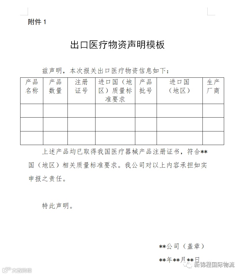 在疫情防控特殊时期,为有效支持全球抗击疫情,保证产品质量安全、规范出口秩序,自4月1日起,出口新型冠状病毒检测试剂、医用口罩、医用防护服、呼吸机、红外体温计的企业向海关报关时,须提供书面或电子声明(模版见附件1),承诺出口产品已取得我国医疗器械产品注册证书(相关注册信息见附件2),符合进口国(地区)的质量标准要求。