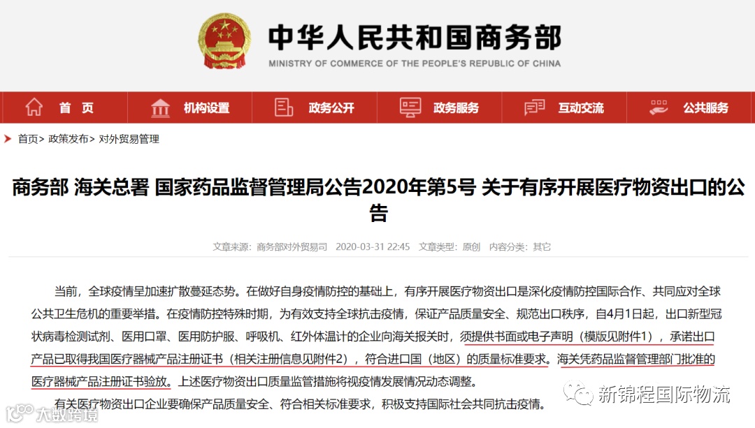 商务部 海关总署 国家药品监督管理局公告2020年第5号 关于有序开展医疗物资出口的公告