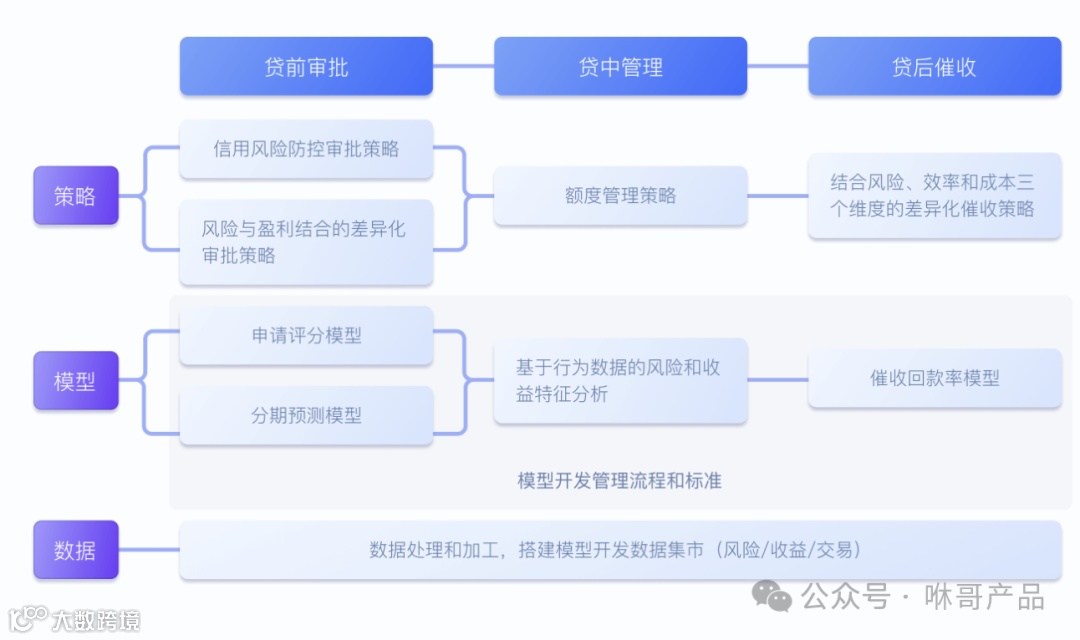 一个完整的风控模型体系应该是什么样子的呢?从风控流程的角度来看,信贷风控主要包括数据采集、反欺诈、策略制定、模型构建和催收等步骤。这每一个步骤都如同一道关卡,共同守护着信贷业务的安全。