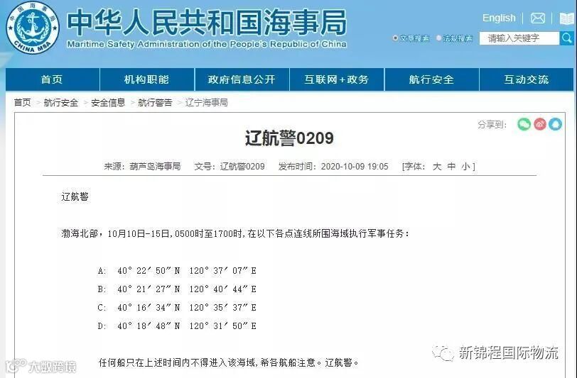 辽宁海事局发布执行军事任务公告,渤海北部,10月10日-15日,0500时至1700时,在以下各点连线所围海域执行军事任务:
