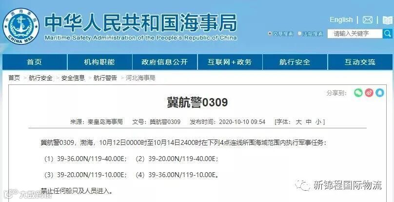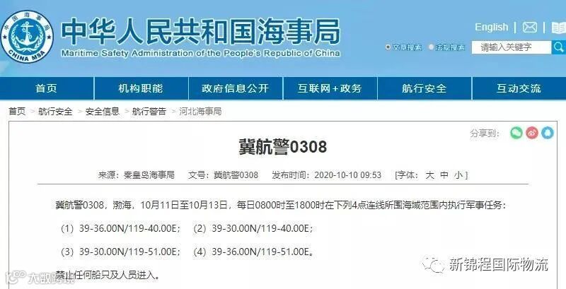 河北海事局发布执行军事任务公告,10月12日0000时至10月14日2400时在下列4点连线所围海域范围内执行军事任务: