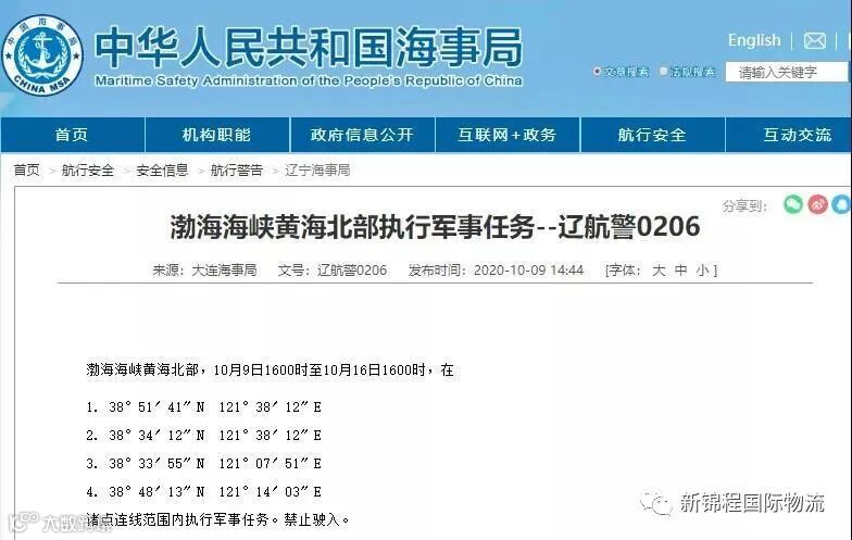 辽宁海事局发布执行军事任务公告,渤海海峡黄海北部,10月9日1600时至10月16日1600时,在1.38°51′41″N 121°38′12″E2.38°34′12″N 121°38′12″E3.38°33′55″N 121°07′51″E4.38°48′13″N 121°14′03″E诸点连线范围内执行军事任务。禁止驶入。