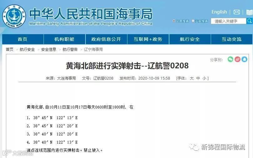 辽宁海事局发布渤海进行实弹射击公告,渤海,10月11日0000时至10月15日2400时。