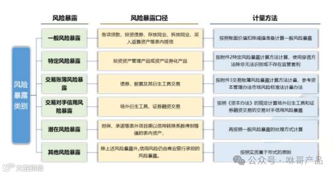大额风险管理暴露体系,涉及银行的全部资产类业务,对于银行的信用风险管理,市场风险管理从客户集中度风险的层面提出了管理和计量要求。管理办法在潜在风险暴露,交易对手信用风险及合格缓释的认定等计量方法中引用了资本管理办法中相关的参数和计量规则。因此,按照管理办法中第一章第六条所指,商业银行应将大额风险暴露管理纳入全面风险管理体系,建立完善与业务规模及复杂程度相适应的组织架构、管理制度、信息系统等,有效识别、计量、监测和防控大额风险。
