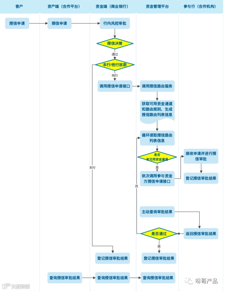 一款贷款产品可配置多个可用资金通道,并根据业务要求配置资金路由规则,产品进件申请时,系统根据可用资金通道和资金路由规则,进行资金通道排序,系统按照资金通道排序依次路由到资金方进行申请,直到有资金方审批通过,并将该资金方信息方信息返回给上游系统,若路由完所有资金通道,都没有审批通过,则根据系统配置,由自由资金放款或者“无可用资金通道”!资金对接平台是支持金融机构进行联合贷业务对接科技平台,其业务方向主要是为打通主贷行与参与行交易交互。