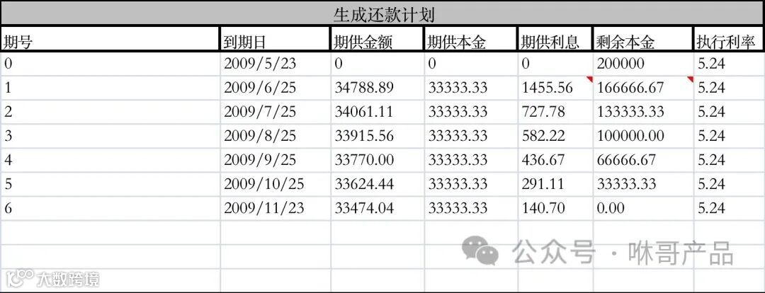 例如:2009-5-23放款200000、年利率5.24%、扣款日25号、6期、等额本金;
