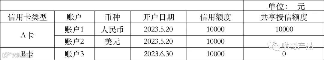 举一个例子,某位客户拥有两张同一银行发行的信用卡,假设分别为A 卡和B 卡。两张卡共享10000 的信用额度,当这位客户使用A 卡消费3000元后,当他再用B 卡去消费时,由于B 卡的额度与A 卡共享,这就意味着B 卡实际只能使用7000元的额度。假设A 卡为双币信用卡,由人民币和美元两个账户组成,两个账户共享10000元人民币,美元账户的信用额度为等值人民币,上述情况在信用报告中展示为: