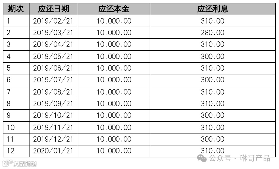 假设2019年1月21日发放本金120000元,每月21日还本10000元,每天的利息是10元。则我们会得到以下的还款计划: