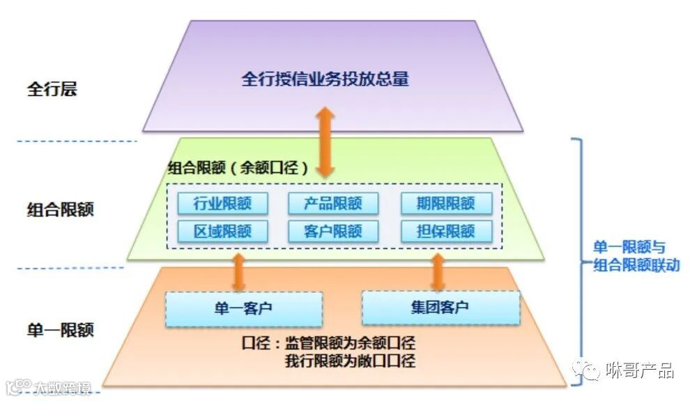组合限额,主要考虑多个维度方面的限额总量:行业限额、产品限额、期限限额、区域限额、客户限额、担保限额等,一般为余额口径。金融机构可根据信用风险战略、风险偏好、信贷发展目标等,综合银行资本实力、未来市场形势、监管要求以及收益预期等信息,确定总体信用风险限额,设定行业、地区、机构、客户、币种、担保和产品的信贷组合风险限额,避免集中度风险,有效防止信贷风险过于集中在组合层面的某些方面。