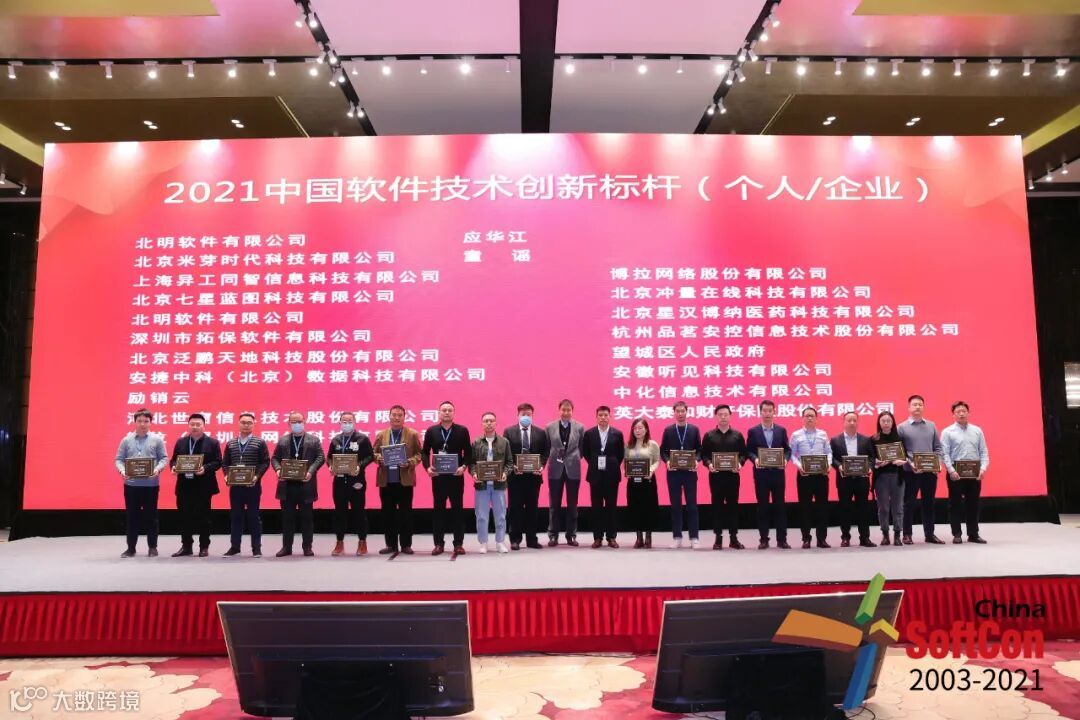 在上午的大会主会场,还进行了2021中国软件技术创新标杆企业及个人、创新标杆软件产品、解决方案、应用服务的颁奖仪式。北明软件等20多家企业最后通过中国软件技术大会与《信息化和软件服务网》联合组织的材料申报,材料审核与评议,网络公示反馈等环节后获得了创新标杆奖,大会设立该奖项旨在鼓励和推动了更多的软件企业和软件技术从业人士进行技术创新,推动整体软件技术水平的提高。