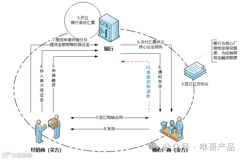 10) 票据解付:如银行承兑汇票到期前10个工作日,保证金达到100%,到期兑付后,该笔保兑仓业务结束;如银行承兑汇票到期前10个工作日,保证金不足100%,银行向核心厂商发出《退款通知书》,核心厂商退款后,兑付到期汇票,业务结束;如核心厂商未按期退款,银行通知经销商,要求其兑付到期汇票,兑付后业务结束。