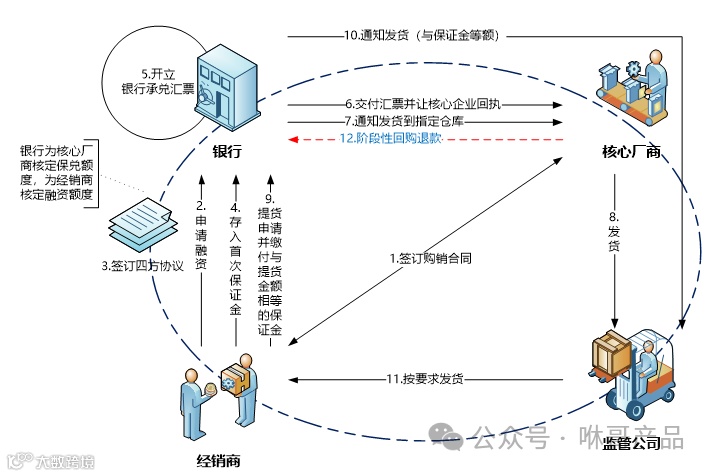 12) 如银行承兑汇票到期前10个工作日,保证金达到100%,到期兑付后,该笔保兑仓业务结束;如银行承兑汇票到期前10个工作日,保证金不足100%,银行向核心厂商发出《担保回购通知书》,核心厂商退款回购后,兑付到期汇票,业务结束。