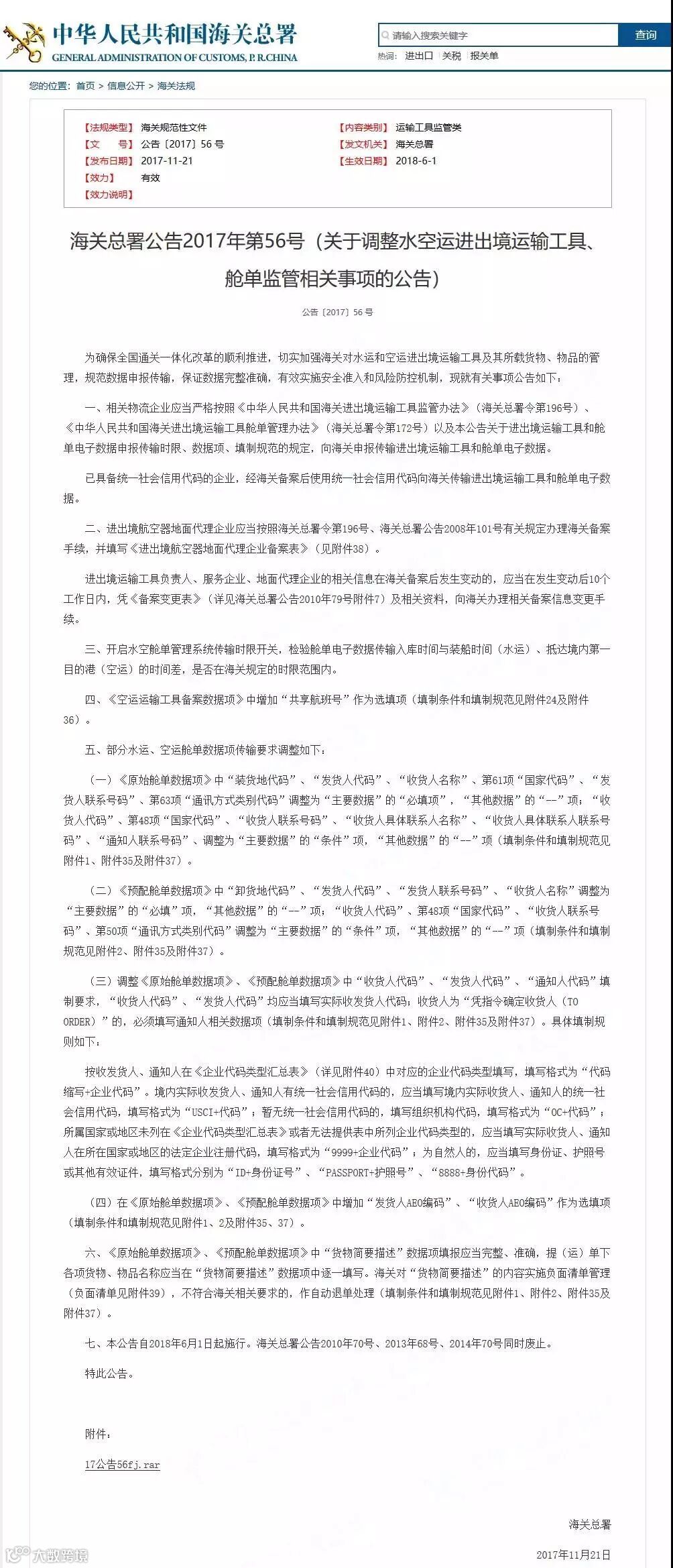 2017年11月,海关总署发布了《关于调整水空运进出境运输工具、舱单监管相关事项的公告》。公告中提出的新规与要求与海运行业密切相关,并将于今年6月1日起开始实行。