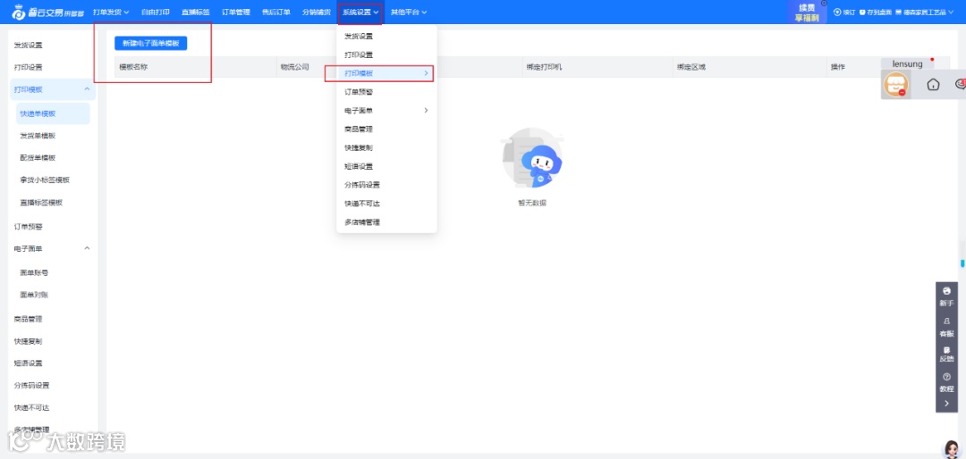 在软件中找到“系统设置”,点击进入后选择 “打印模板”,再找到 “快递单模板设置”。