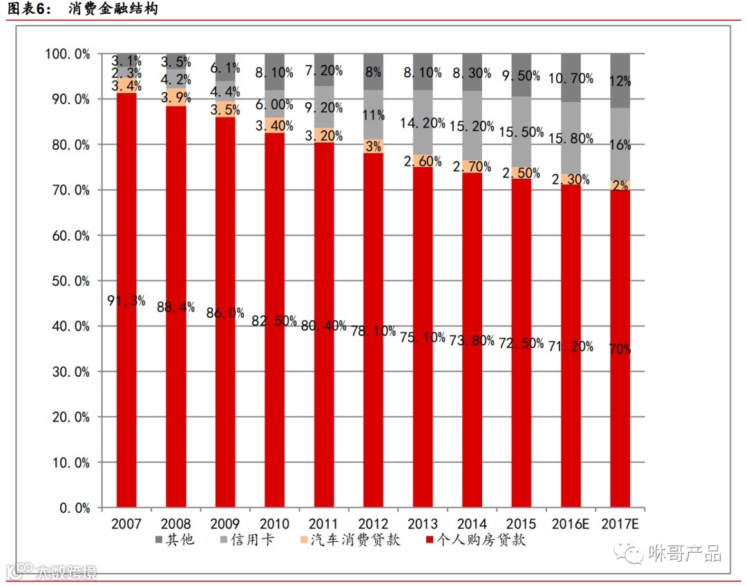 从信贷用途来分析,可分为住房消费金融、汽车消费金融、信用卡以及其他消费品金融;