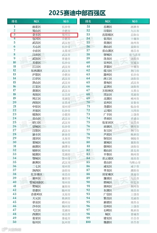中原网讯 (记者 于露 )赛迪顾问发布2025中部百强区榜单,郑州市金水区再次以第三名的佳绩稳居中部地区第一方阵。作为河南省会核心城区,金水区不仅连续多年稳居中部前列,更是中部地区少数突破“两千亿级”经济总量的城区之一。这一成绩的背后,是其从“商贸老城”向“产创高地”的华丽转身,更是经济活力迸发、营商环境优化、创新动能澎湃的综合体现。