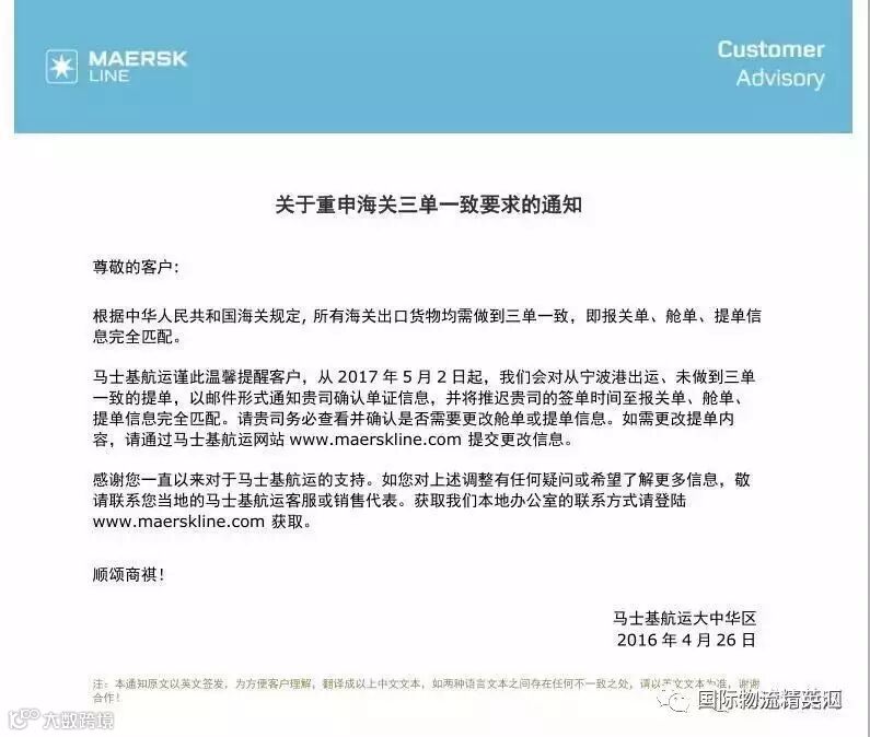 MSK船公司通知:根据中华人民共和国海关规定, 所有海关出口货物均需做到三单一致,即报关单、舱单、提单信息完全匹配。从 2017 年 5 月 2 日起,MSK会对从宁波港出运、未做到三单一致的提单,以邮件形式通知客户确认单证信息,并将推迟客户的签单时间至报关单、舱单、提单信息完全匹配。