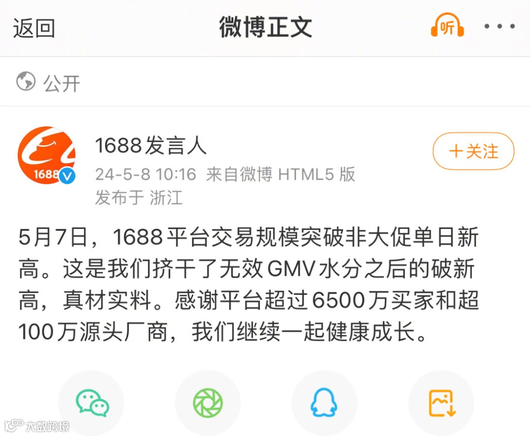 5月8日消息,微博帐号1688发言人的消息显示,5月7日,1688平台交易规模突破非大促单日新高。